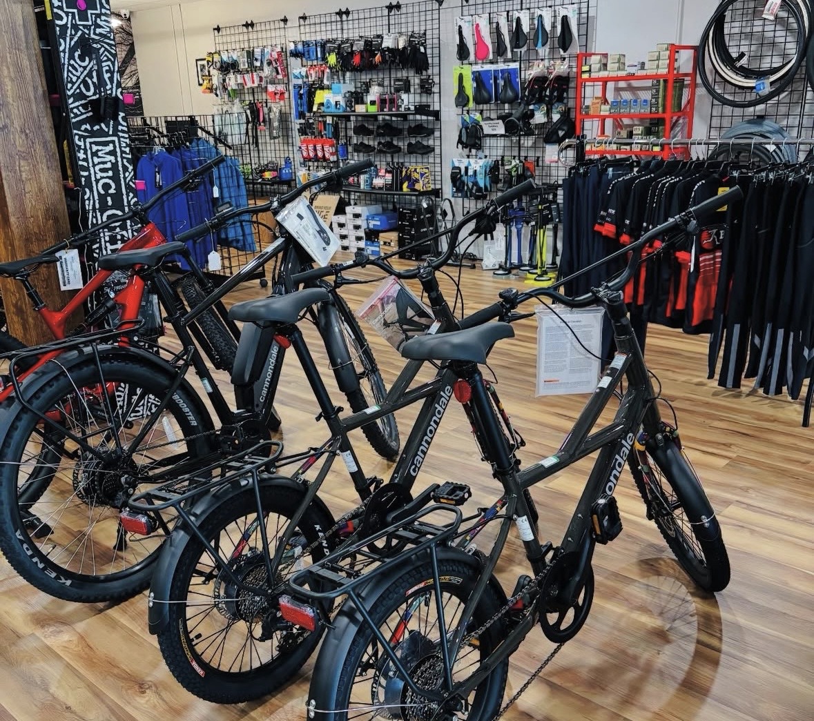 We expand upstairs โ full bike shop with service, repairs, and tri-gear. Cannondale bikes, tubes, tune-ups, everything you need to ride.